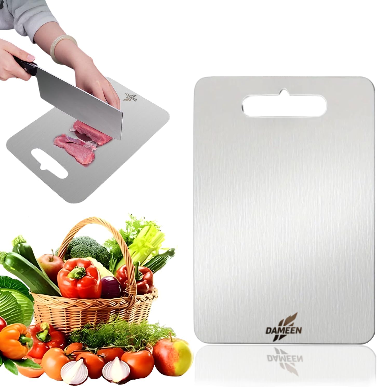 • ✅ Premium Stainless Steel Build – Crafted by DAMEEN with heavy-duty 304 food-grade stainless steel, this professional cutting board is designed to withstand daily kitchen tasks. Unlike wooden or plastic boards that crack, absorb unwanted smells, or get scratched, the DAMEEN cutting board offers unmatched durability, strength, and long-lasting performance—making it an essential upgrade for every modern kitchen.
